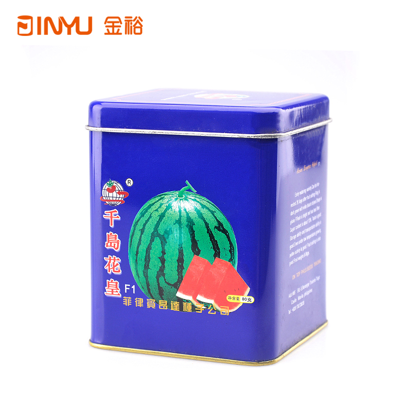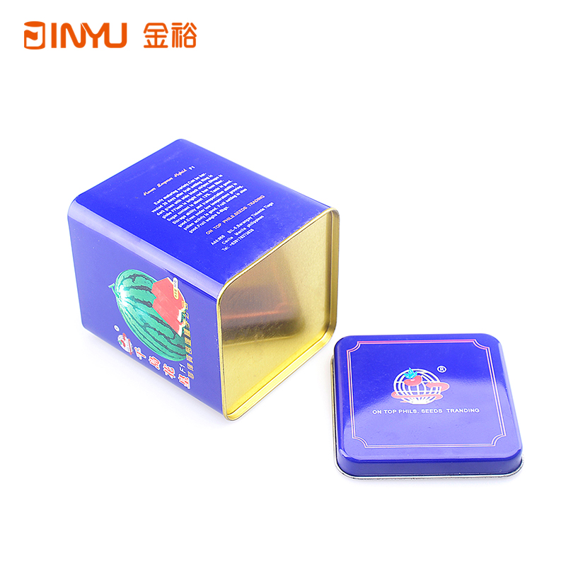 【產(chǎn)品簡介】該款方形小鐵盒是用來裝西瓜種子的,采用我司現(xiàn)有模具生產(chǎn),該小鐵盒除了用作種子鐵盒以外,還用過茶葉、巧克力等產(chǎn)品包裝,也做過出口,老外也是拿來做種子鐵盒包裝的。小鐵盒,大用途。