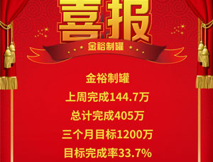 今天是2018年7月31日,牛商爭霸賽的第一階段即將結(jié)束,6月25日的啟動大會還歷歷在目,時間卻已悄然掠過。這一個月,金裕制罐總計完成了405萬銷售額,而三個月的總目標是1200萬,目標完成率33.7%,金裕制罐超額完成了第一階段的計劃。按照目前發(fā)展勢頭,拿下1200萬...